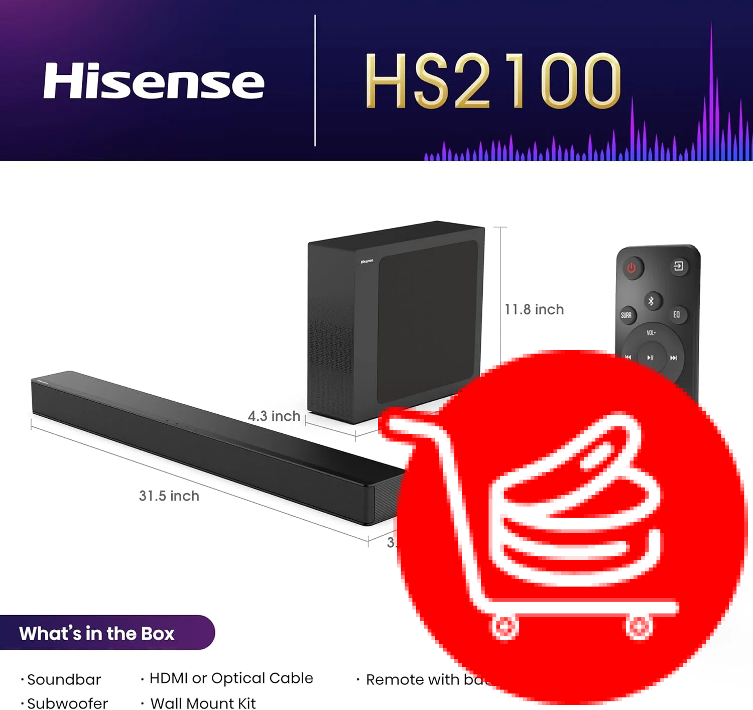 Experience Cinematic Sound with the Hisense HS2100 Soundbar The Hisense HS2100 2.1 Channel Soundbar delivers 240W of immersive audio, enhanced by a wireless subwoofer for deep, powerful bass. Ideal for TVs 32 inches or larger, this soundbar supports Dolby Audio and DTS Virtual:X, creating a rich, surround-like experience for movies, games, and music. Bluetooth 5.3 enables effortless streaming from your smartphone or tablet, while HDMI ARC provides a simple, single-cable connection to your TV. With six EQ modes (Movie, Music, News, Sports, Game, Night), you can tailor the sound to your preferences.Seamless Connectivity and Sleek Design Designed for ease of use, the Hisense HS2100 offers versatile connectivity with HDMI ARC, optical, AUX, and USB inputs. The wireless subwoofer ensures clutter-free placement, delivering booming bass without extra cables. Its compact, modern design fits seamlessly under your TV, while Roku TV Ready certification allows control with a Roku TV remote. This soundbar is perfect for enhancing your home theater on a budget, offering premium audio performance and reliability backed by Hisense’s 2-year warranty.