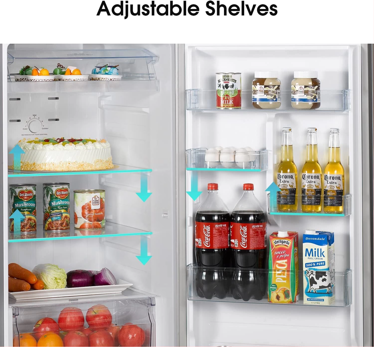 Elevate your kitchen with the Hisense RT419 419L Double Door Frost-Free Refrigerator, a premium appliance designed for large households, entertaining, or shared spaces. This sleek silver top-mount fridge offers a spacious 419-liter gross capacity (314L net), featuring a total no-frost system that eliminates manual defrosting for effortless maintenance. Equipped with a non-plumbed water dispenser, it provides instant access to chilled water, enhancing convenience. The interior boasts adjustable spill-proof tempered glass shelves, a moisture-controlled vegetable crisper, an egg tray, and door bins for 2L bottles, all illuminated by soft LED lighting. With a multi-air flow system, electronic controls, and eco-friendly R600a refrigerant, the Hisense RT419 ensures energy-efficient cooling (A+ rating) and superior food preservation