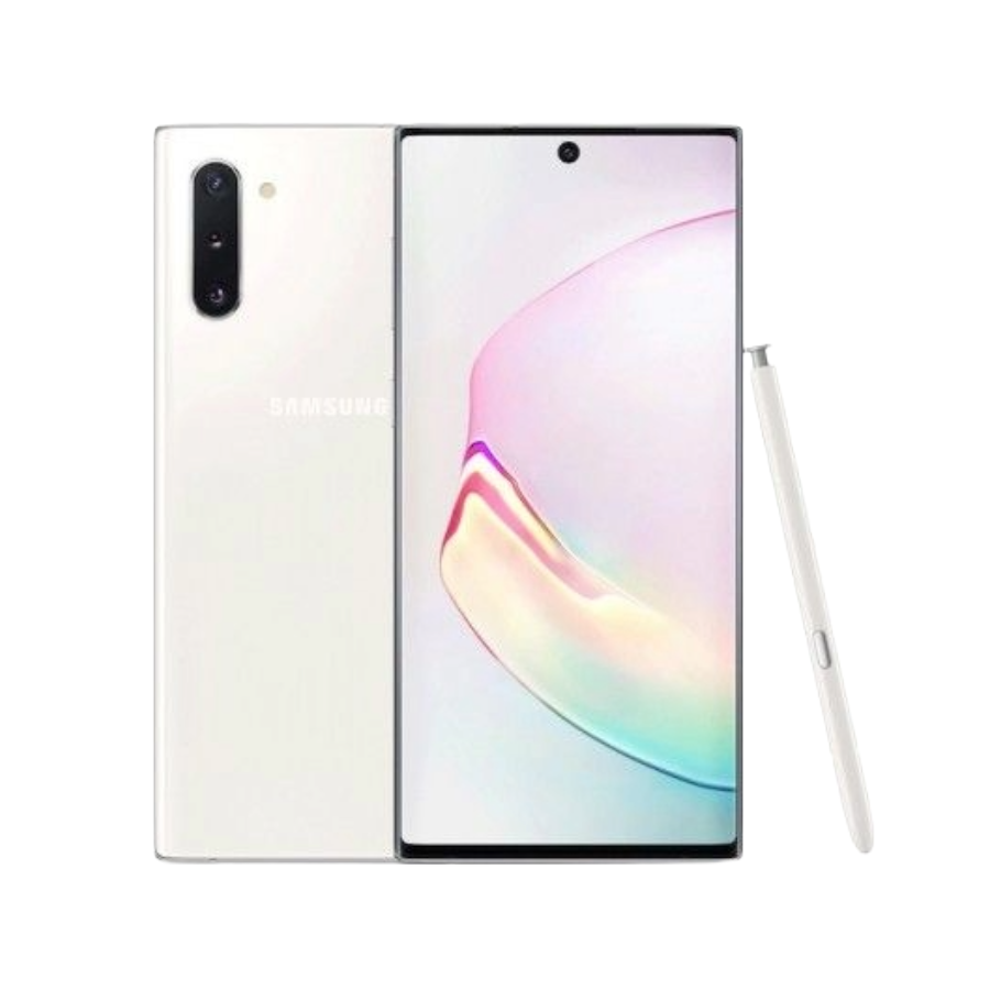 Product details Introducing level powerWith Galaxy Note10 and Note10+ we've designed a mobile experience that’s like a computer, a gaming console, a movie-tech camera, and an intelligent pen, all in one device. Now comes in two sizes: powerful and powerfulFor the first time ever, you can choose the Note size that fits you best. Impossibly thin designHigh-polish metal and glass meld seamlessly — all in an impressively slim design. WIDTH7.9mmUpper half of Galaxy Note10 seen from the side with no buttons to show its thin design. It turns to reveal the Infinity-O Display seen at a three-quarter angle.Cinematic Infinity-O DisplayWith a tiny, front-facing camera lens, the display is a Dynamic AMOLED that's brilliant in all conditions. Close-up of Galaxy Note10 plus’s cinematic Infinity-O Display with a flower onscreen Woman sitting in a car holding Galaxy Note10 plus in landscape mode. Download manager notifications appear showing three large files being downloaded at the same time thanks to the fast data capabilities Galaxy Note10 seen in landscape mode with a shadow and a hand touching the top as if its a laptop Power to make your day last all dayOur cutting-edge battery intelligence ensures Galaxy Note10's 3500mAh (typical) outlasts your day.4, 5 SUPER FAST CHARGING30MIN. CHARGE GIVES YOUAll dayPOWER6 Think it. Write it.Capture it Close up of S Pen ejected from Galaxy Note10. On scroll, the S Pen and Galaxy Note10 move further from each other to reveal text Four Galaxy Note10 phones seen laying face up with a variety of Samsung Notes uses onscreen, and two blue S Pens. One screen shows a sketch of a face, another shows Text Export, the shows a note with the zoom GUI overlaid on top, and the last phone shows writing with the background color settings menu Control your device through clicks and gesturesAir actions let you zoom in or out with the camera, change the volume, or flip through photos and more with a simple wave or click.9 image Galaxy Note10 seen in landscape mode with a Screen off memo onscreen Flat lay of several accessories including LED View Cover, Galaxy Watch Active2, Galaxy Buds, and Protective Standing Cover